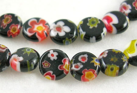 Бусины изготовлены в муранской технике из стекла миллефиори. Представлены в черном цвете. Внутри маленькие цветочки контрасного цвета по отношению к основному. Купить бусины миллефиори можно от 1шт.