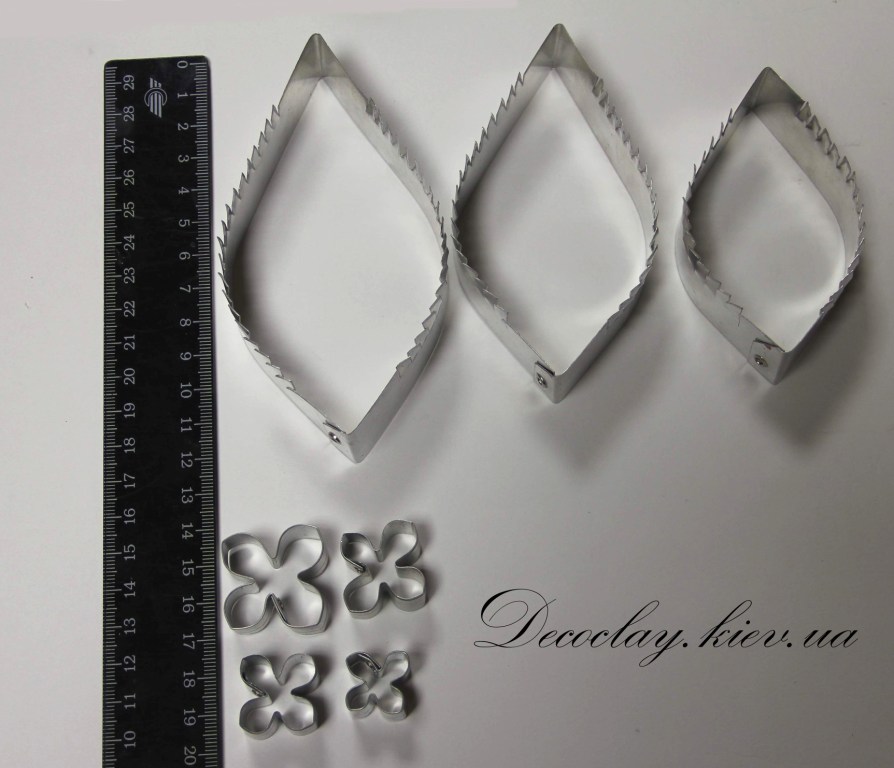Очень хороший качественный каттер, включает в себя лепестки разных размеров, листья в 3-ех размерах, а также чашелистик. Примечателен тем, что край лепестков, вырезанный этим каттером, будет иметь мелкий зубчатый волнистый край. Предназначен для изготовления отдельных лепестков и последующей сборке в одно соцветие. Цветок получается более натуральный и очень пышный. Рекомендуется покупать в комплексе с молдом листа гортензии большим и листом земляники, который используется для придания текстуры лепесткам.