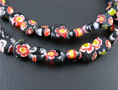 Бусины изготовлены по муранской технологии из мозаичного стекла. Мелкие черные с красными мелкими цветочками по поверхности. Купить можно от 5 гр (30 бусин)