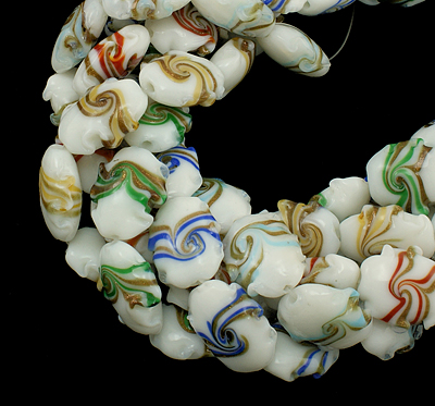 Бусины выполнены в технике лэмпворк. Имеют разноцветные  разводы на поверхности в виде завитков. Купить бусины лэмпворк можно от 1-ой шт.