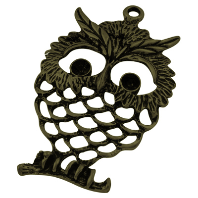 Подвеска в виде совы с ажурным телом. В глазах имеются углубления для вклеивания стразин. Не содержит в своем составе никель. Односторонняя.