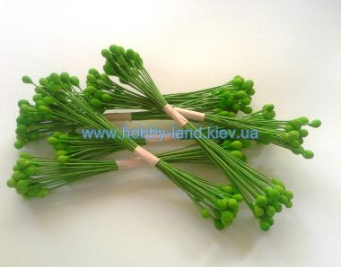 Достаточно крупные округлые салатовые тычинки на светло-зелёной проволоке №26. Подходят для имитации небольших бутонов, например, гортензии. В пучке 25 проволочек. Каждая тычинка двухсторонняя. Длина проволоки 10 см.